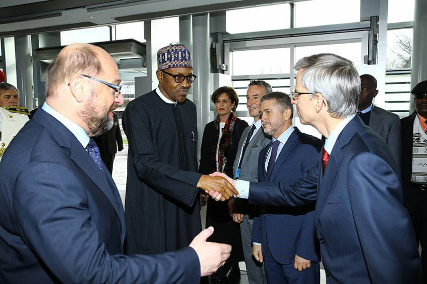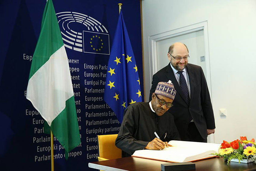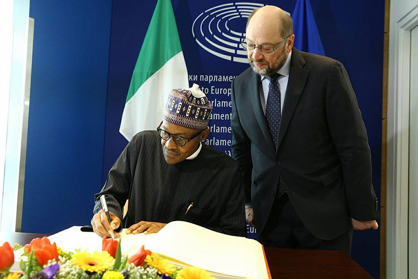 President Muhammadu Buhari and the President of the European Parliament, Mr Martin Schulz in Strasbourg, France held bilateral talks on matters of mutual interest. Here, the Nigerian President signs visitors’ register, among other formalllities: