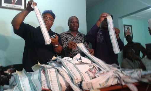 “Throughout Saturday night and up to 1 pm today (Sunday 29 March,1 pm), thumb printing of ballot papers and collation of results are ongoing in the houses of the following government officials: Aniekan Umana, commissioner for information, in Abak; Governor Akpabio’s country home in Ukana; Don Etim, Commissioner for Works in Ikot Ekpene; Emmanuel Enoidom, commissioner for special duties in Etim Ekpo; Enobong Uwah, commissioner for environment in Uyo; Senator Effiong Bob in Nsit Ubium, and Eno Akpan, Commissioner for Lands and Town Planning in Ukanafun, just to mention a few”.