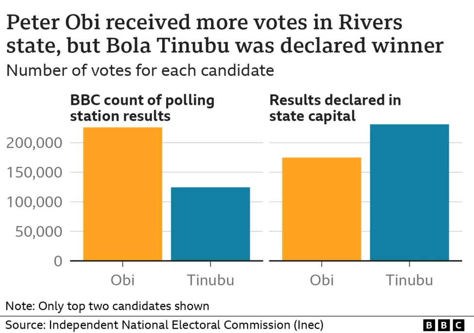 An investigation by the BBC on Rivers State’s presidential election result has exposed how the votes of the Labour Party presidential candidate in the February 25 election were cut by more than half and given to Bola Ahmed Tinubu who flew the flag of the All Progressives Congress.