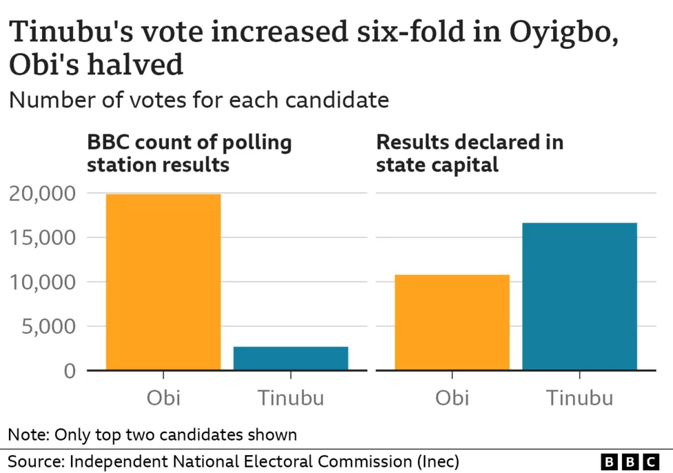 The count for Mr Obi was announced officially as just 3,829 votes, but the BBC counted 74,033 votes for him on the tally sheets.