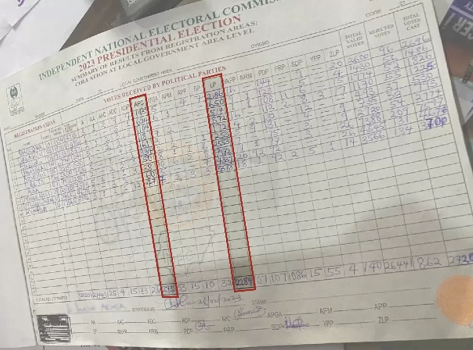 The numbers in this document closely matched our own tallies for the two leading candidates (Obi and Tinubu).