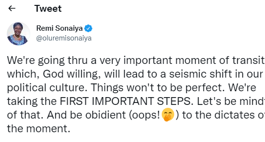 She said: “We’re going thru a very important moment of transition which, God willing, will lead to a seismic shift in our political culture. Things won’t be perfect. We’re taking the FIRST IMPORTANT STEPS. Let’s be mindful of that. And be obidient (oops!?) to the dictates of the moment.”