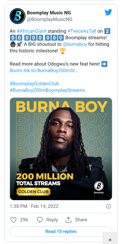 He also recognised that social media users in Africa are beginning to appreciate the digitization of music and streaming, adding that the milestone is an iconic feat for Burna Boy and Boomplay.