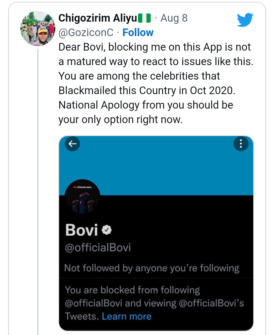 He wrote: “Dear Bovi, blocking me on this App is not a matured way to react to issues like this. You are among the celebrities that Blackmailed this Country in Oct 2020. National Apology from you should be your only option right now.”