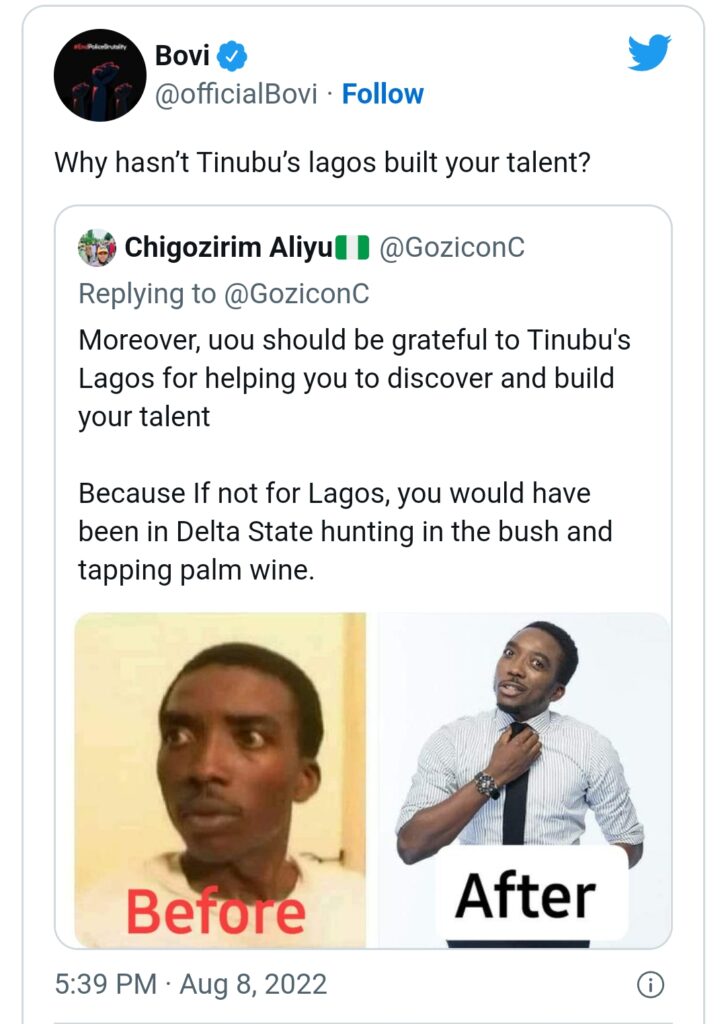 Bovi, while responding to the comments of the obviously angry Chigozirim said, “why hasn’t Tinubu’s Lagos built your talent?”