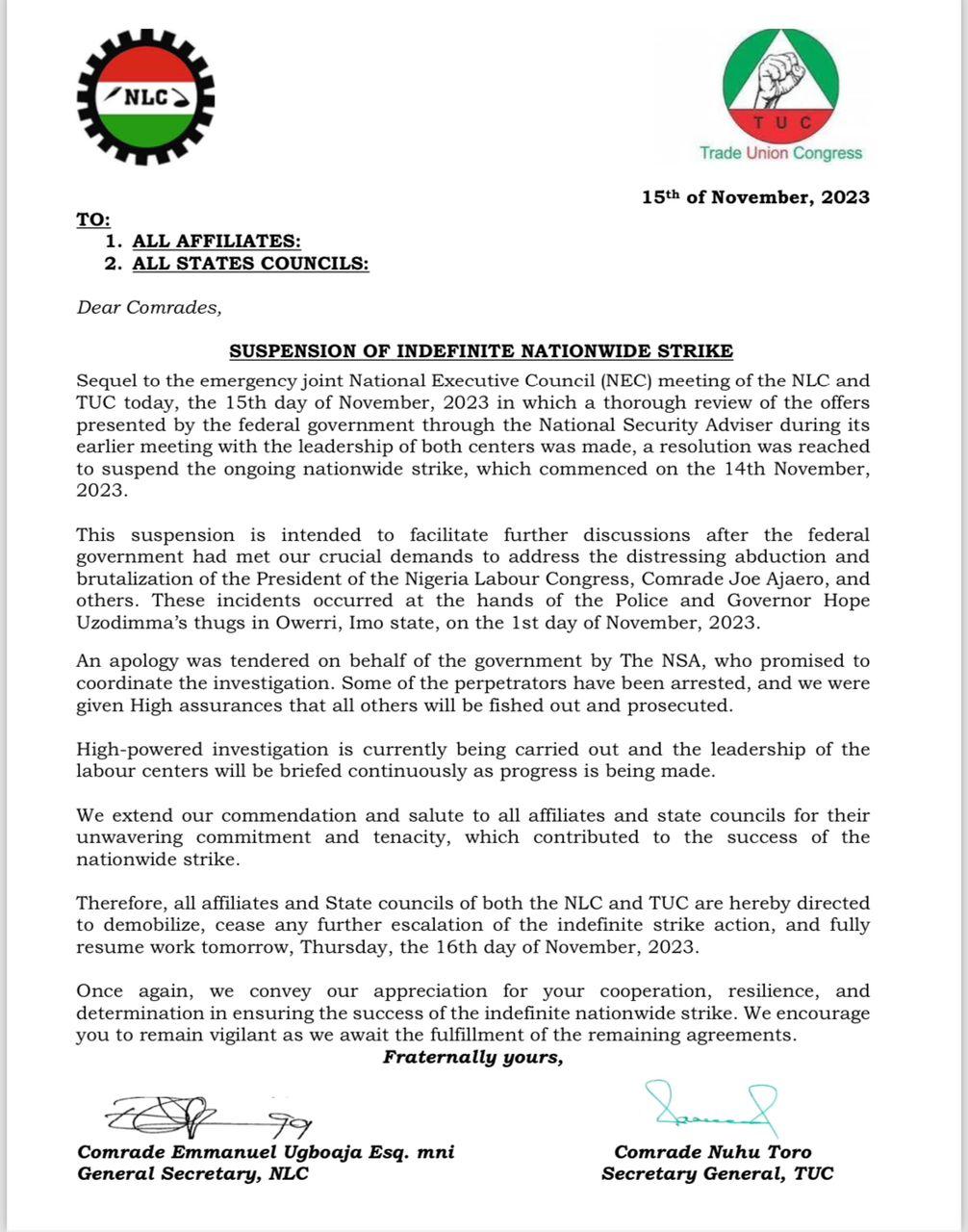 The Joint National Executive Council (NEC) meeting of the Nigeria Labour Congress (NLC) and Trade Union Congress of Nigeria (TUC) has suspended the ongoing strike over the battering of the NLC President, Joe Ajaero, among other pending issues.