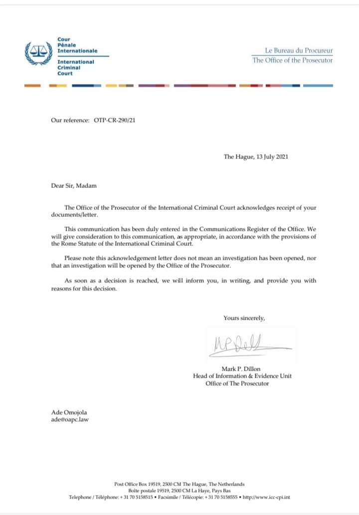 In a letter to the petitioners’ Lawyer, the ICC’s Head of Information and Evidence Unit of the Office of the Prosecutor, Mr. Mark P. Dilon, wrote: “As soon as a decision is reached to formally commence investigation into this petition, we will inform you, in writing, and provide you, with reasons for this decision.