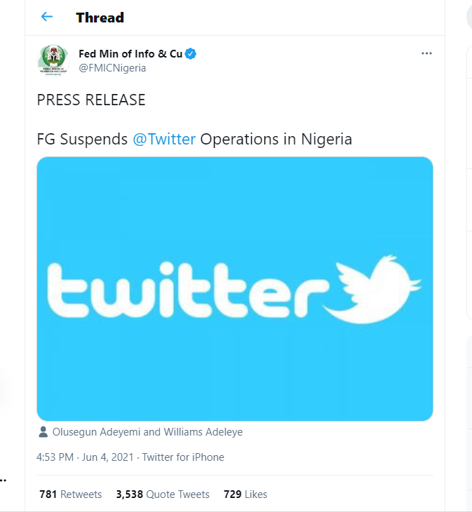 The most curious of them all is the Federal Ministry of Information whose minister, Lai Mohammed, just announced the ban on Twitter. The ministry’s Twitter handle used the same Twitter to tweet the speech of Lai Mohammed.