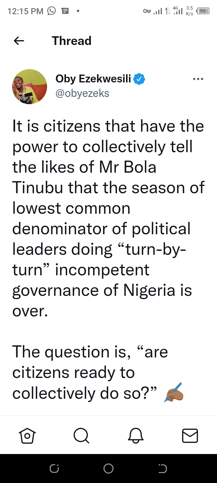 Former minister of education, Oby Ezekwesili, reacted to Tinubu’s declaration on her twitter handle @obyzeks, saying: “It is citizens that have the power to collectively tell the likes of Mr Bola Tinubu that the season of lowest common denominator of political leaders doing “turn-by-turn” incompetent governance of Nigeria is over. The question is, “are citizens ready to collectively do so?”