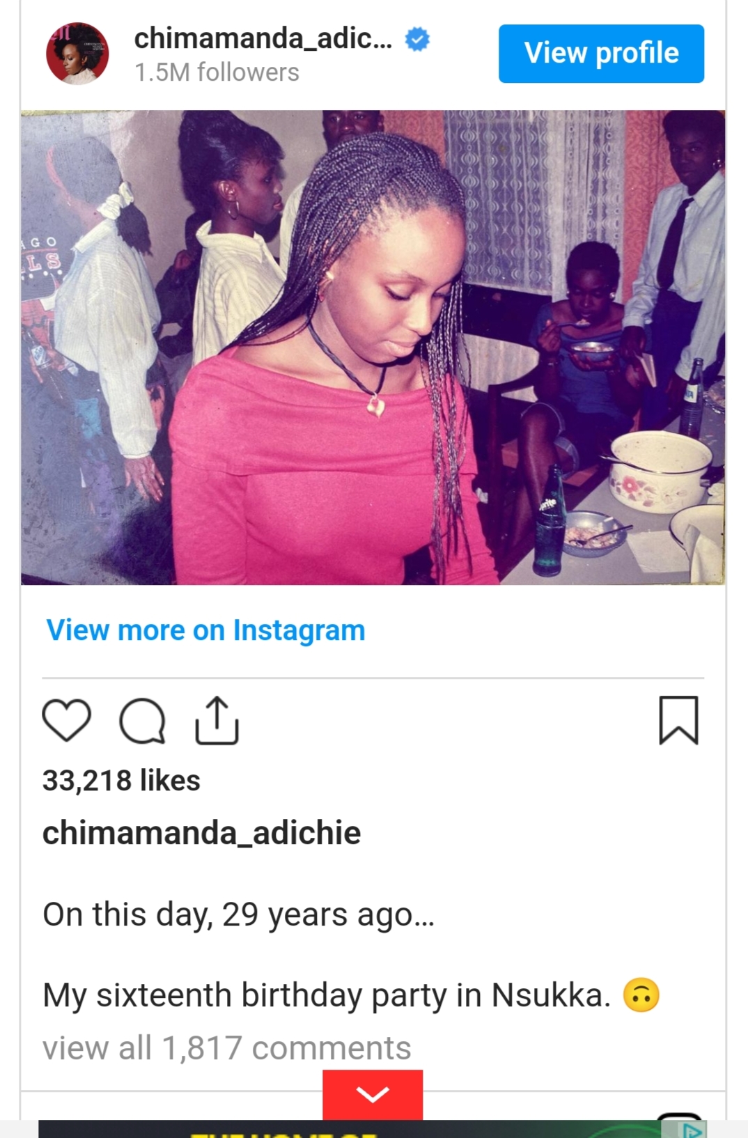 Chimamanda captioned the photo, “On this day, 29 years ago, my sixteenth birthday party in Nsukka.”