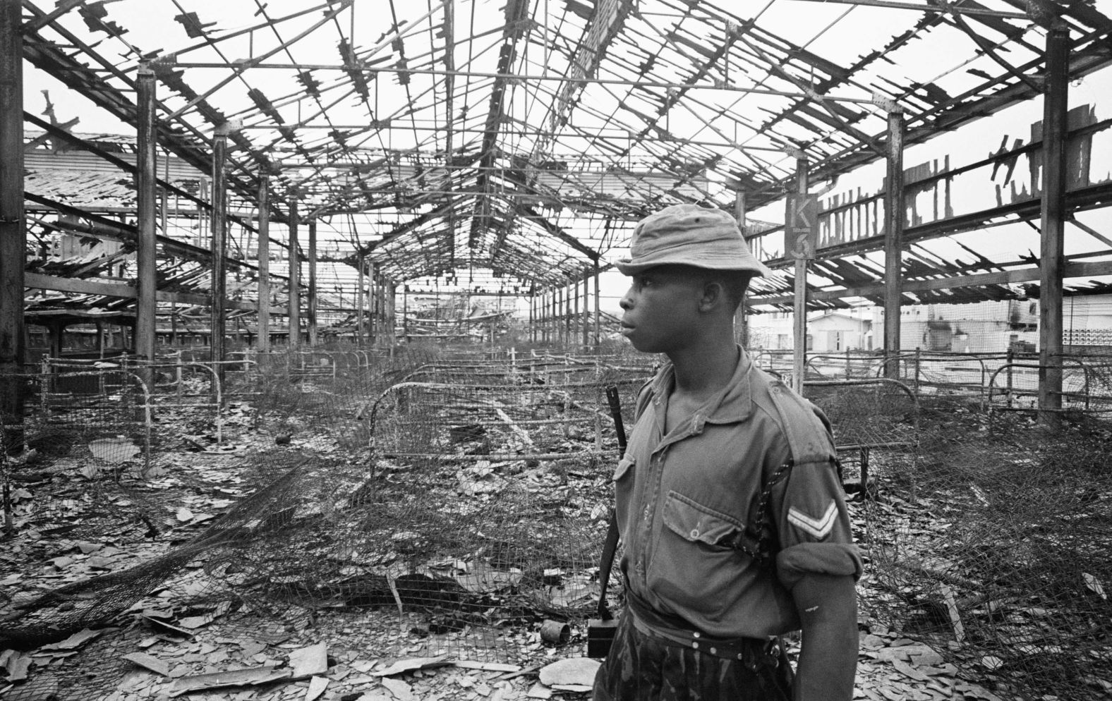 A soldier in the ruins of the Onitsha market after it was gutted during fighting in the city on July 16, 1968. Ron Burton/Mirrorpix/Getty Images