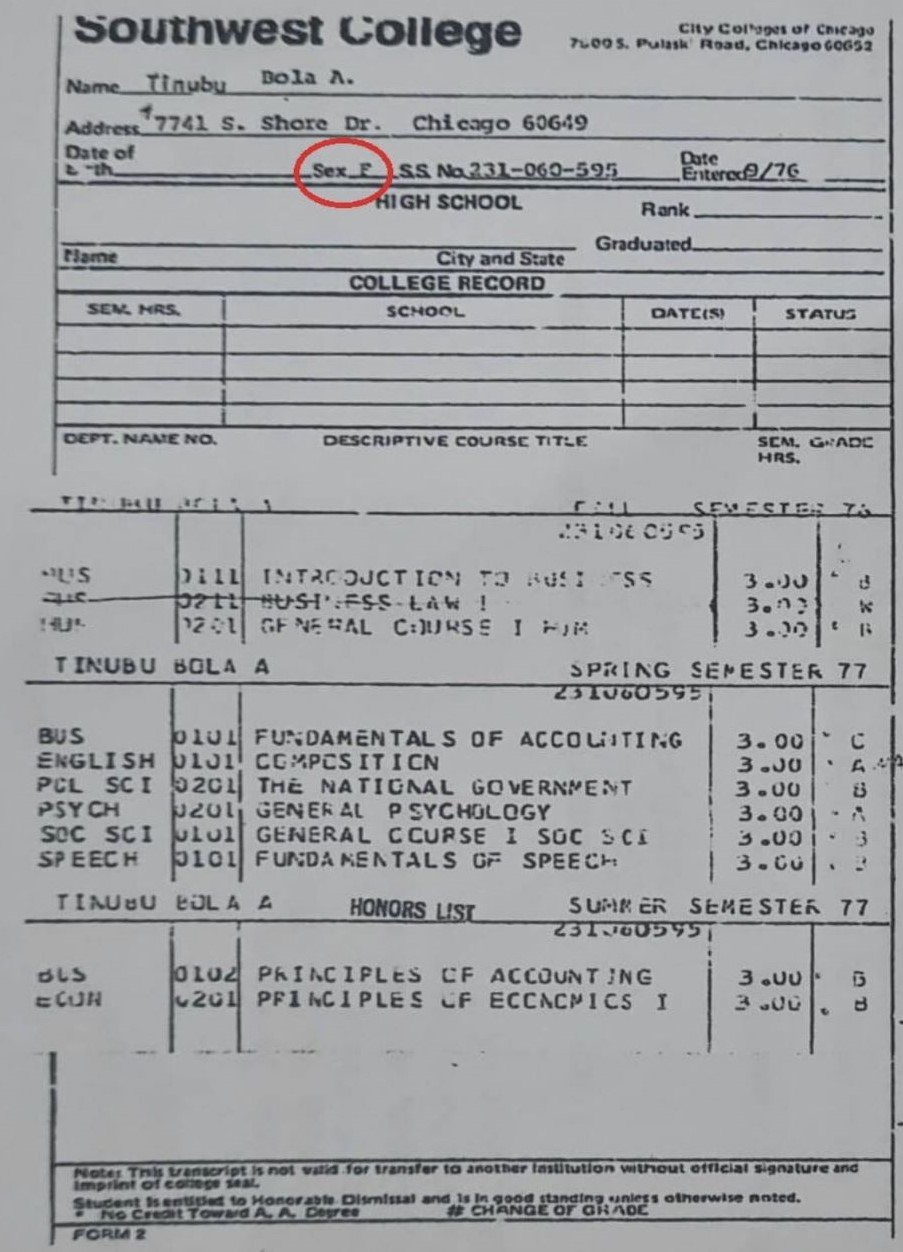 Tinubu argued in the US court the “F” (female) in the transcript was a typographical error, and would perhaps also argue the 1954 year of birth was equally a typo. He may impress with the those claims because they were typed in, not hand written.