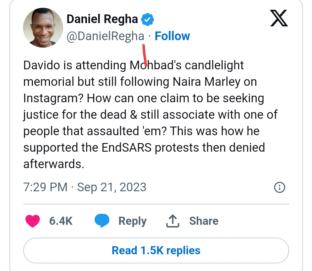 Speaking via his social media page, he tweeted: “Davido is attending Mohbad’s candlelight memorial but still following Naira Marley on Instagram?