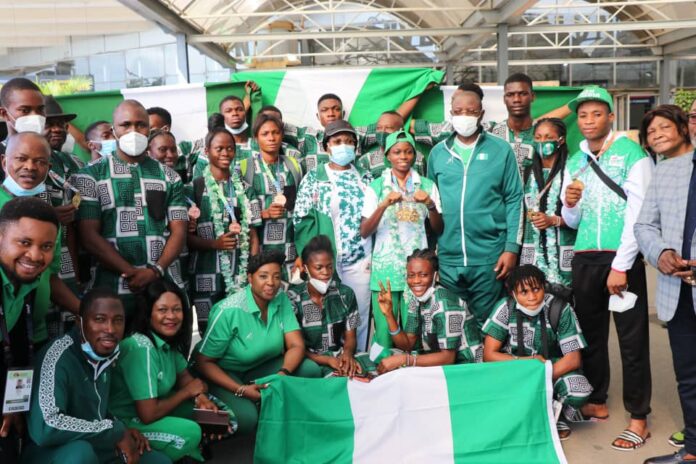 At the brief ceremony, Sports Minister Sunday Dare praised the team for the unprecedented feat of finishing third(out of 116 countries) on the medals table as well as recording Nigeria’s best ever medal haul of four gold and three bronze medals.