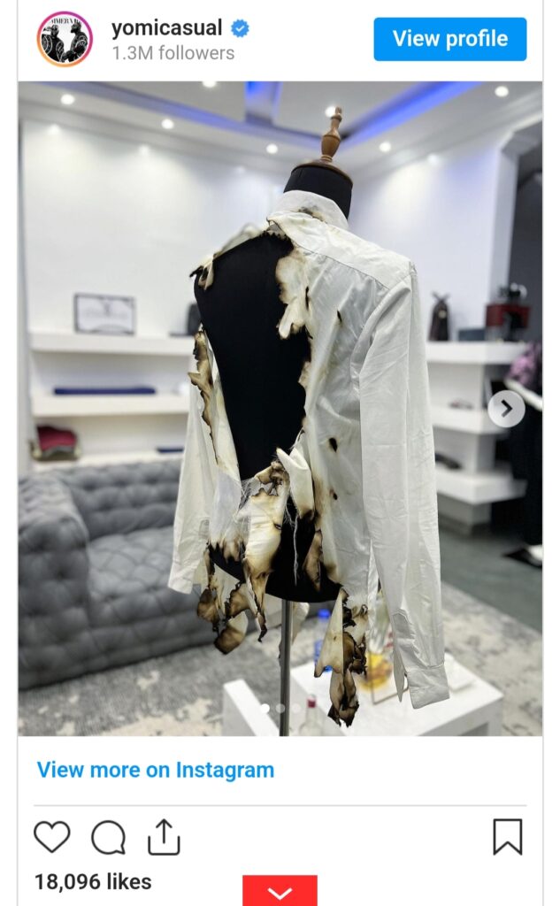 Yomi Casual took to his Instagram page to share the new design which revealed a white button shirt that appeared to be burnt severely
