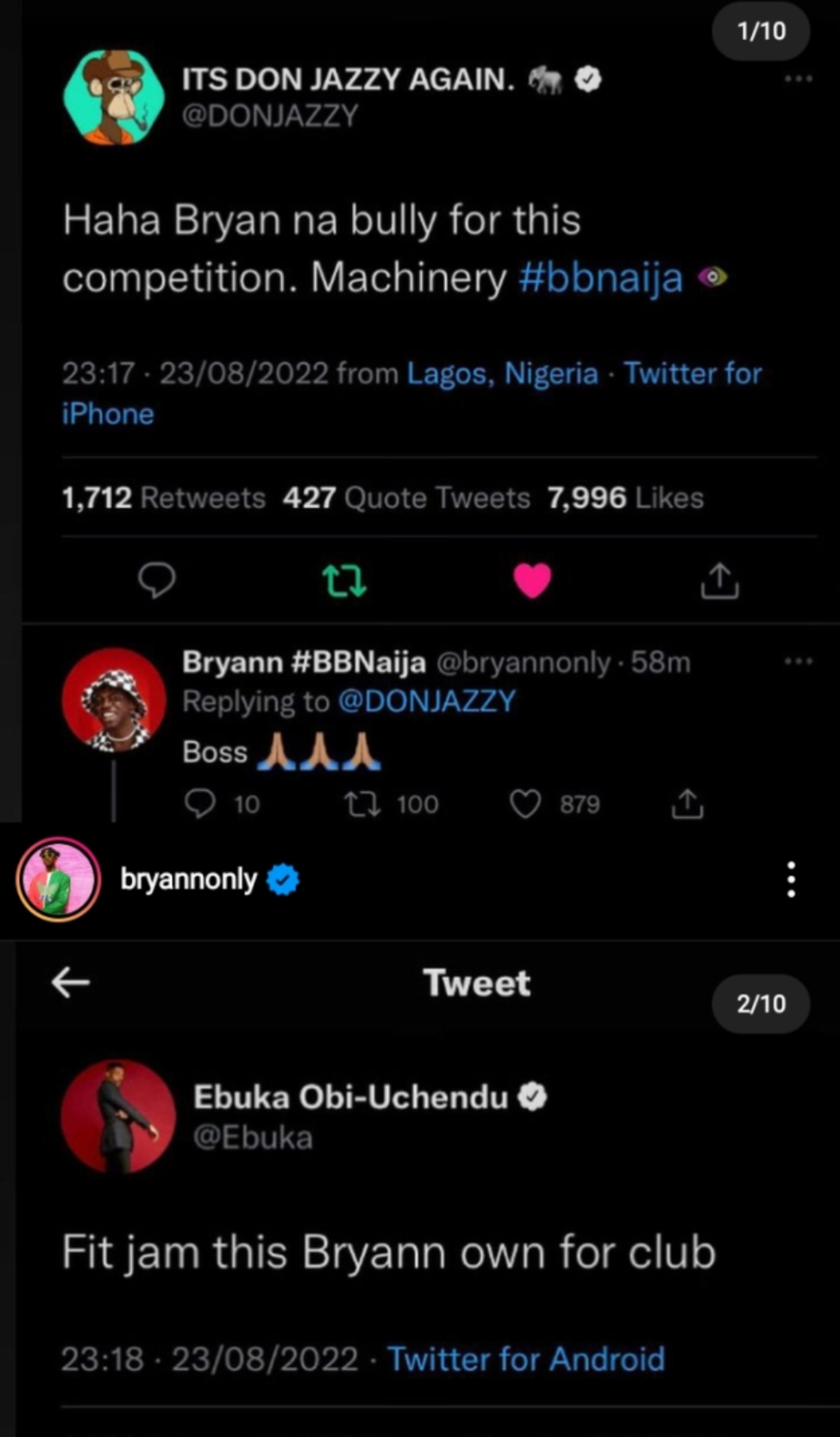 Mavin Records owner and talent hunter, Don Jazzy also jokingly hailed the housemate as he said, “Haha Bryan na bully for this competition. Machinery #bbnaija”