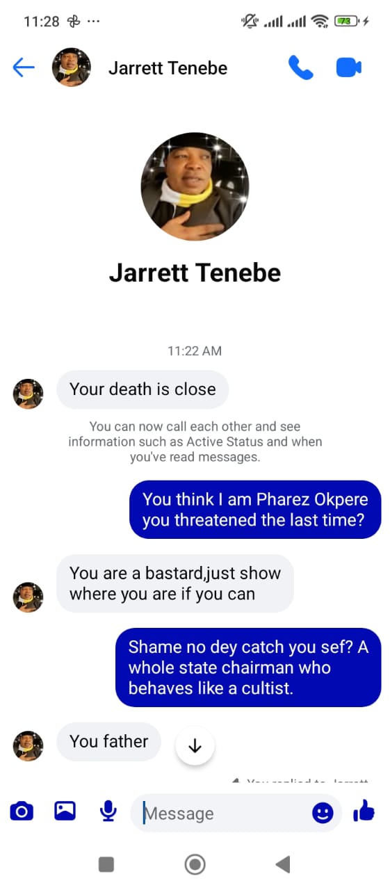 The chilling comments of the ruling party Chairman to Agho were shared via messenger, screengrab of which is published here.