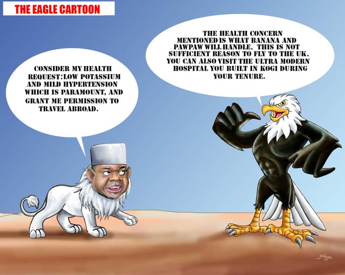 In the cartoon, the White Lion pleaded to be allowed to travel abroad to treat a case of mild hypertension. A black eagle refused the request, saying a case of mild hypertension could be treated with pawpaw and banana. Moreover, the black eagle reminded the White Lion of the specialist hospital he built in his state which could easily handle such medical concern.