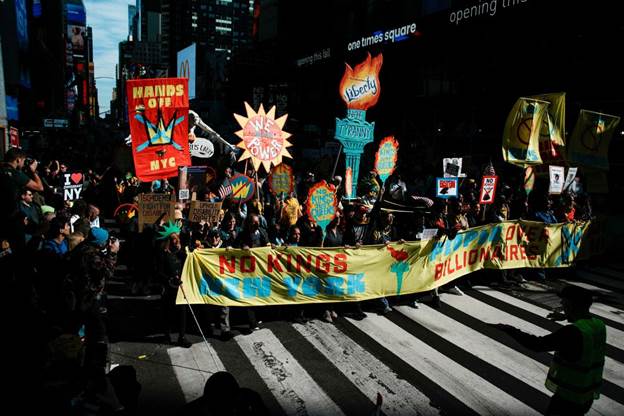 People attend a “No Kings” protest in New York.