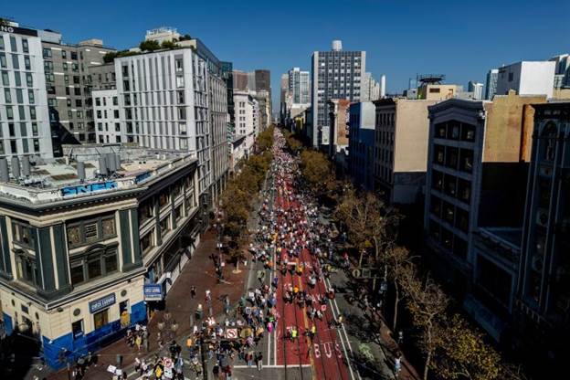 “No Kings” demonstrators march on Market Street in San Francisco.