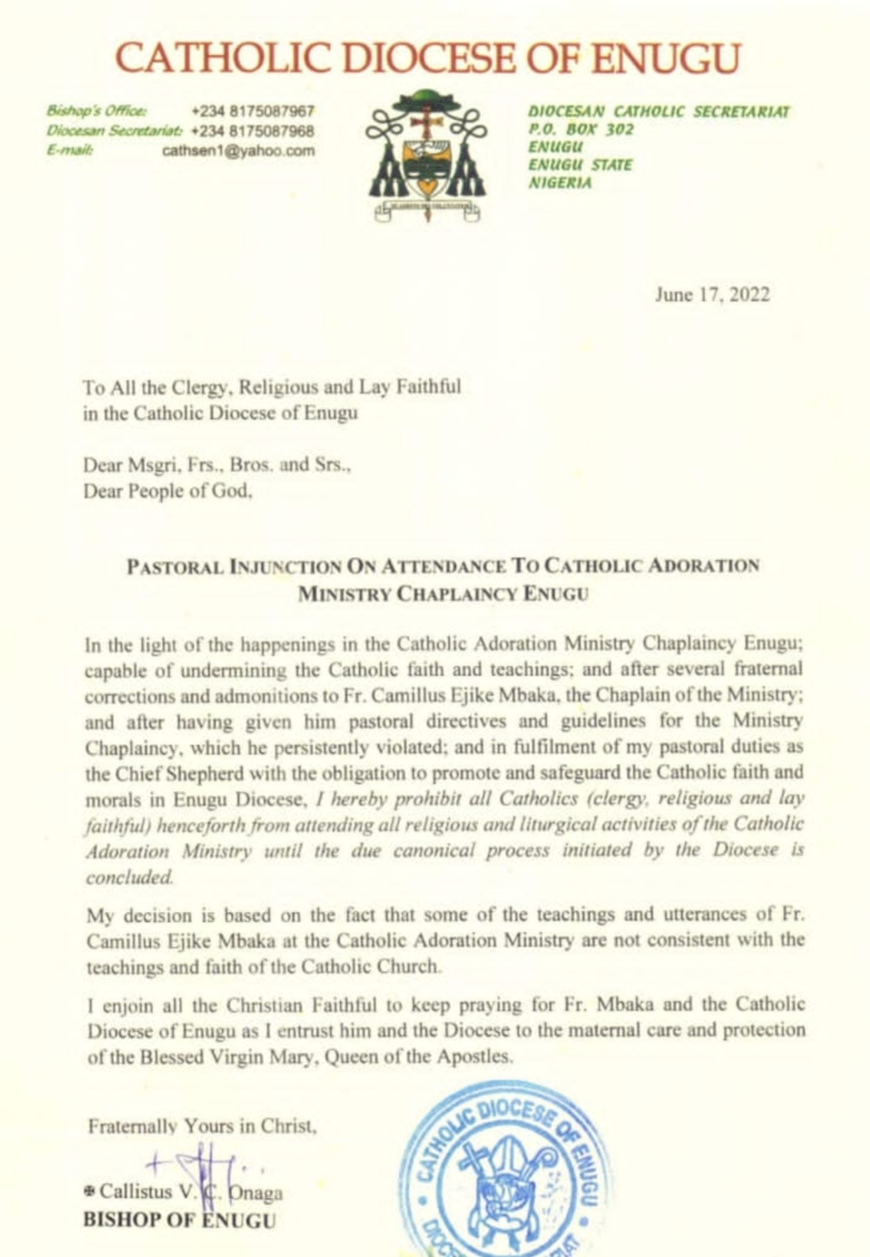 In a letter signed by the Catholic Bishop of the Diocese of Enugu, the church banned ‘All the Clergies and Catholic faithful’ from having any form of dealings with Mbaka and the Adoration Ministry for now.
