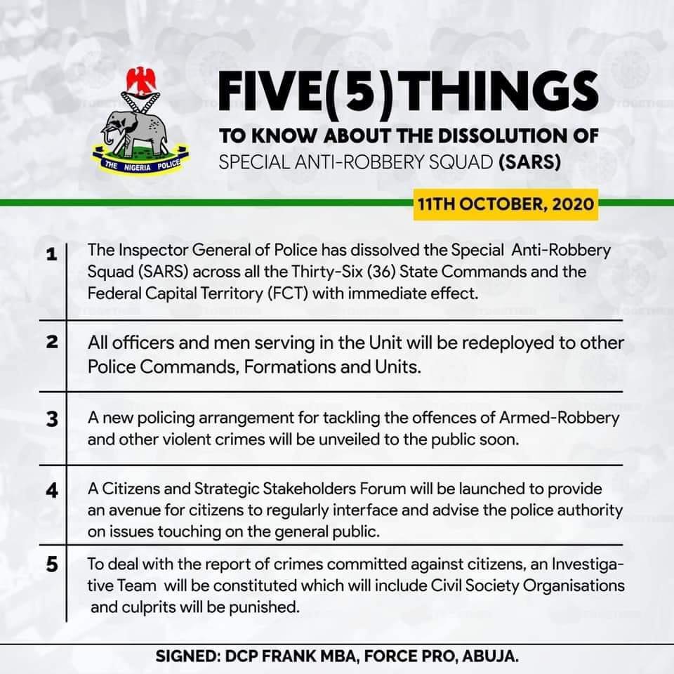 In the finest spirit of democratic, citizen-centred and community policing, the Inspector-General of Police, IGP M.A Adamu, NPM, mni has today, 11th October, 2020, dissolved the Special Anti-Robbery Squad (SARS) across the 36 State Police Commands and the Federal Capital Territory (FCT) where they hitherto existed.