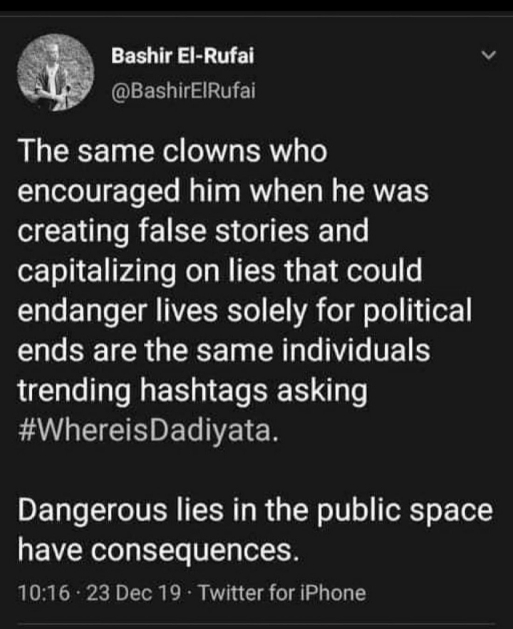 Bashir wrote: “The same clowns who encouraged him when he was creating false stories and capitalizing on lies that could endanger lives solely for political ends are the same individuals trending hashtags asking #WhereisDadiyata. Dangerous lies in the public space have consequences.”
