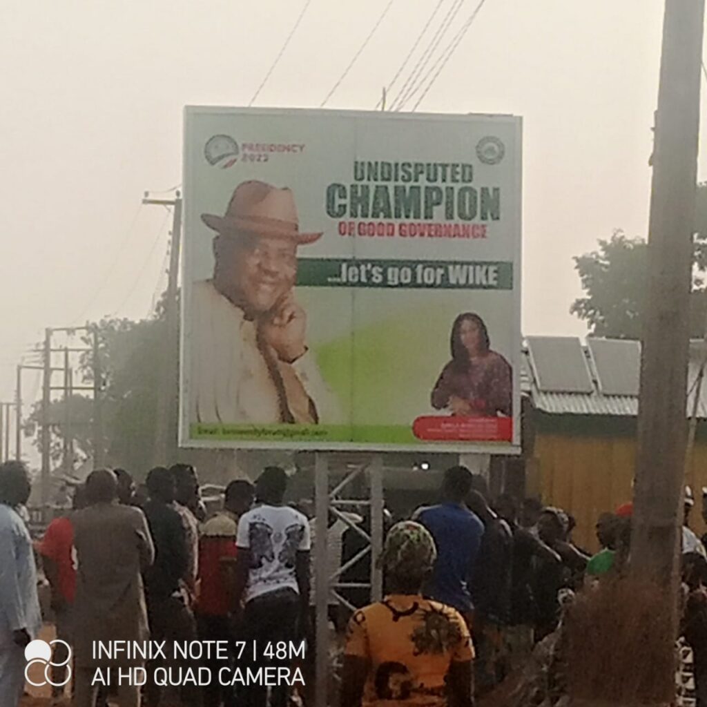 In the evening of Thursday, January 27 when the billboard was first seen at Agan toll gate in Makurdi by the residents, carrying a photograph of the Rivers State governor with an inscription, ‘undisputed Champion, let’s go for Wike’, many people were seen clustering around the location and viewing the billboard with keen interest and enthusiasm.