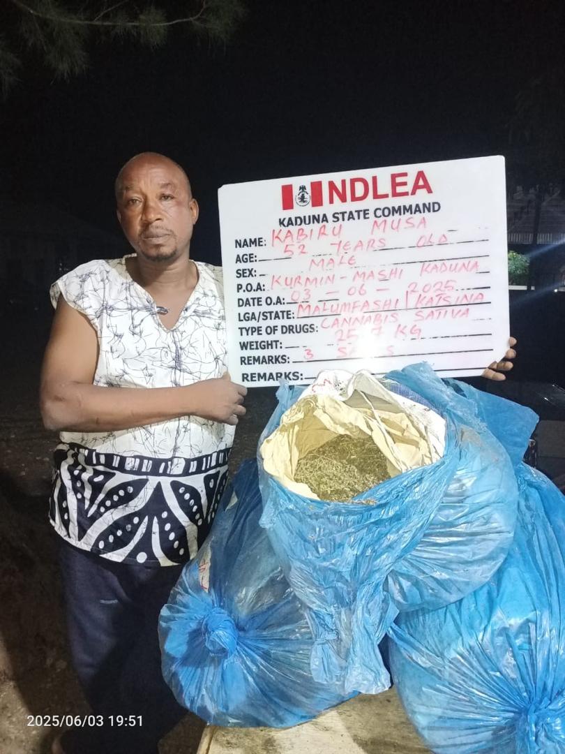 In Kaduna, operatives of the state command of NDLEA on patrol along Abuja – Kaduna expressway on Tuesday, June 3, arrested 29-year-old Goodluck Nnaemeka with 612 bottles of codeine-based syrup and 2,970 pills of flunitrazepam. In another operation same day, a 52-year-old wanted drug dealer Kabiru Musa (a.k.a KB) was arrested at Kurmin Mashi. A total of 25.7kg skunk was earlier recovered from his base.