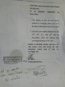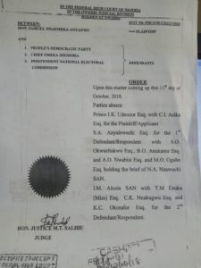 4. To set the record straight, Senator Samuel Anyanwu had in a suit filed at the Federal High Court Owerri against the People’s Democratic Party, (PDP); Imo PDP governorship candidate, Rt. Hon Emeka Ihedioha and the Independent National Electoral Commission (INEC), sought an interim order for the court to restrain Ihedioha from being the party’s governorship candidate in the state and for INEC to be refrained from taking further steps on the matter until the determination of the substantive case. The presiding Judge, Justice Mohammed Salihu refused to grant the order, ruling that the parties should maintain the status quo that was in place before the suit was filed on the 8th of October, 2018.