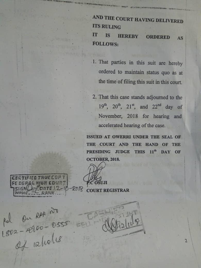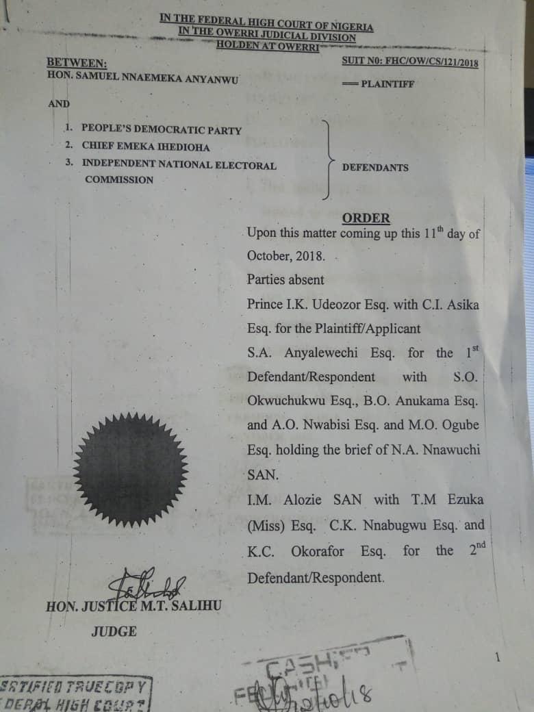 4. To set the record straight, Senator Samuel Anyanwu had in a suit filed at the Federal High Court Owerri against the People’s Democratic Party, (PDP); Imo PDP governorship candidate, Rt. Hon Emeka Ihedioha and the Independent National Electoral Commission (INEC), sought an interim order for the court to restrain Ihedioha from being the party’s governorship candidate in the state and for INEC to be refrained from taking further steps on the matter until the determination of the substantive case. The presiding Judge, Justice Mohammed Salihu refused to grant the order, ruling that the parties should maintain the status quo that was in place before the suit was filed on the 8th of October, 2018.