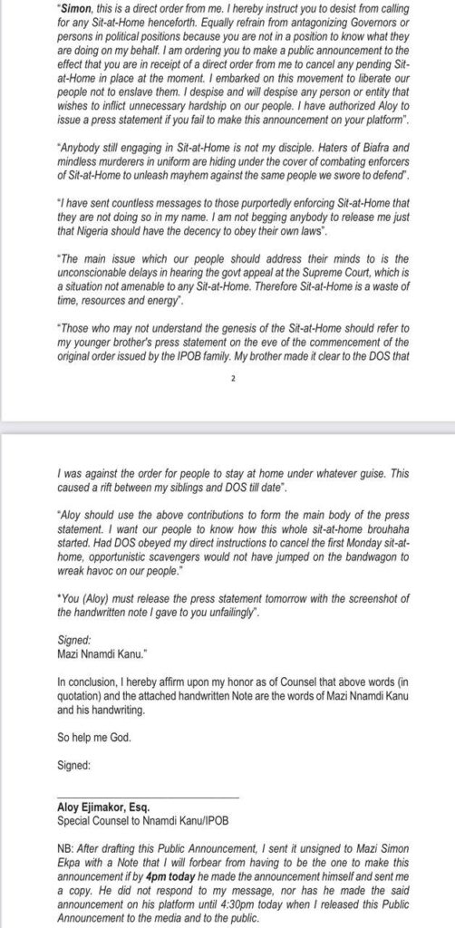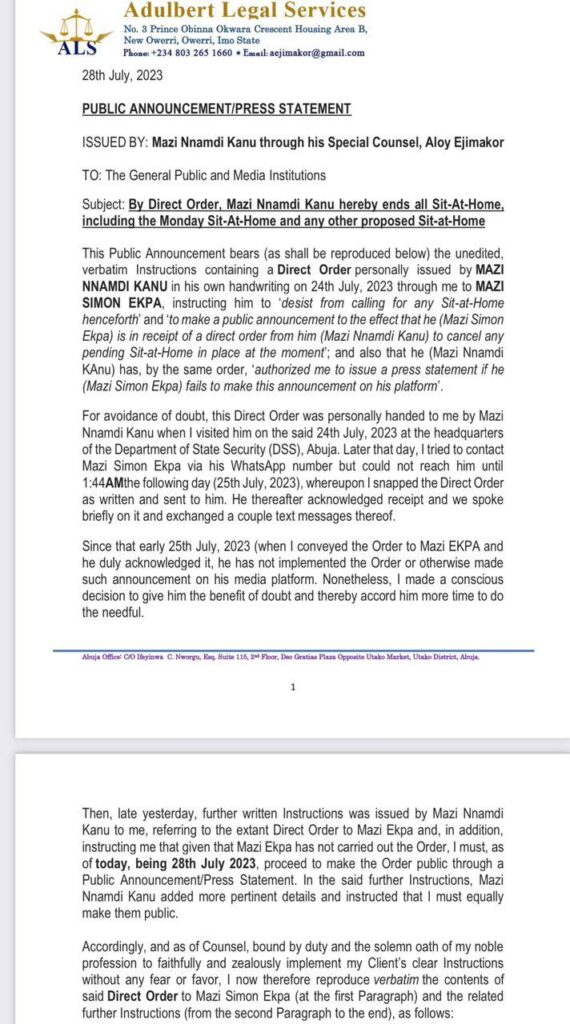 “This Public Announcement bears (as shall be reproduced below) the unedited, verbatim Instructions containing a Direct Order personally issued by MAZI NNAMDI KANU in his own handwriting on 24th July, 2023 through me to MAZI SIMON EKPA, instructing him to ‘desist from calling for any Sit-at-Home henceforth’ and ‘to make a public announcement to the effect that he (Mazi Simon Ekpa) is in receipt of a direct order from him (Mazi Nnamdi Kanu) to cancel any pending Sit-at-Home in place at the moment’; and also that he (Mazi Nnamdi KAnu) has, by the same order, ‘authorized me to issue a press statement if he (Mazi Simon Ekpa) fails to make this announcement on his platform’.