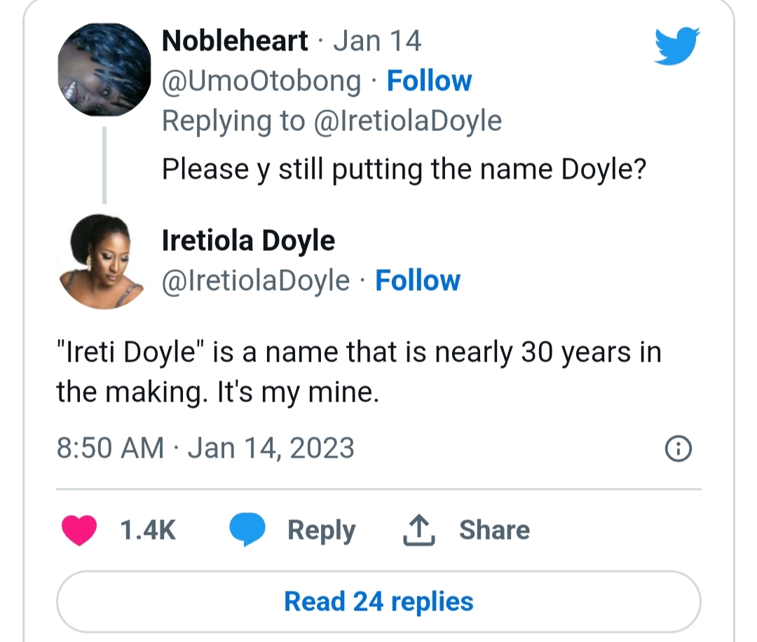 Responding to the netizen, she argued that the name ‘Ireti Doyle’ took her close to 30 years to build and she will not be dropping it soon.