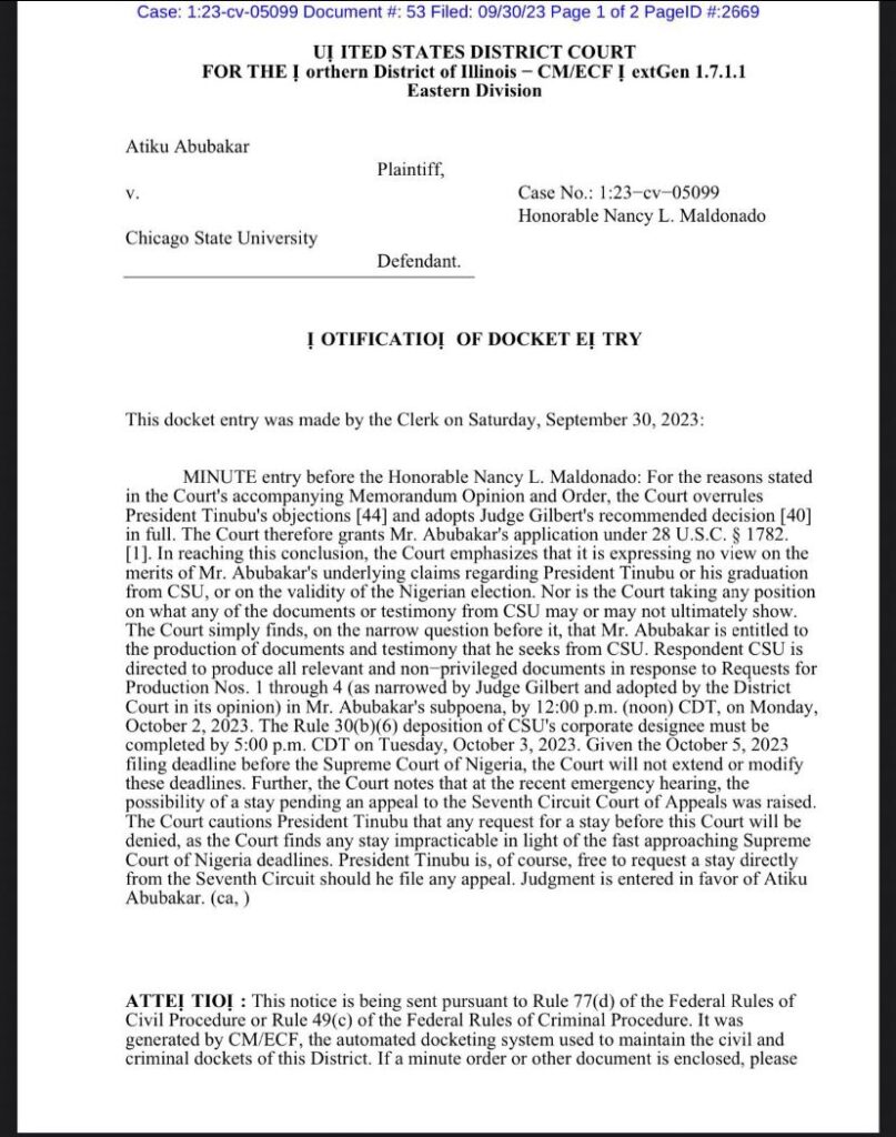 Judge Maldonado, on Saturday, ruled against Tinubu’s objection pleading that the release of his Chicago State University (CSU) records would cause him severe and irreparable harm.
