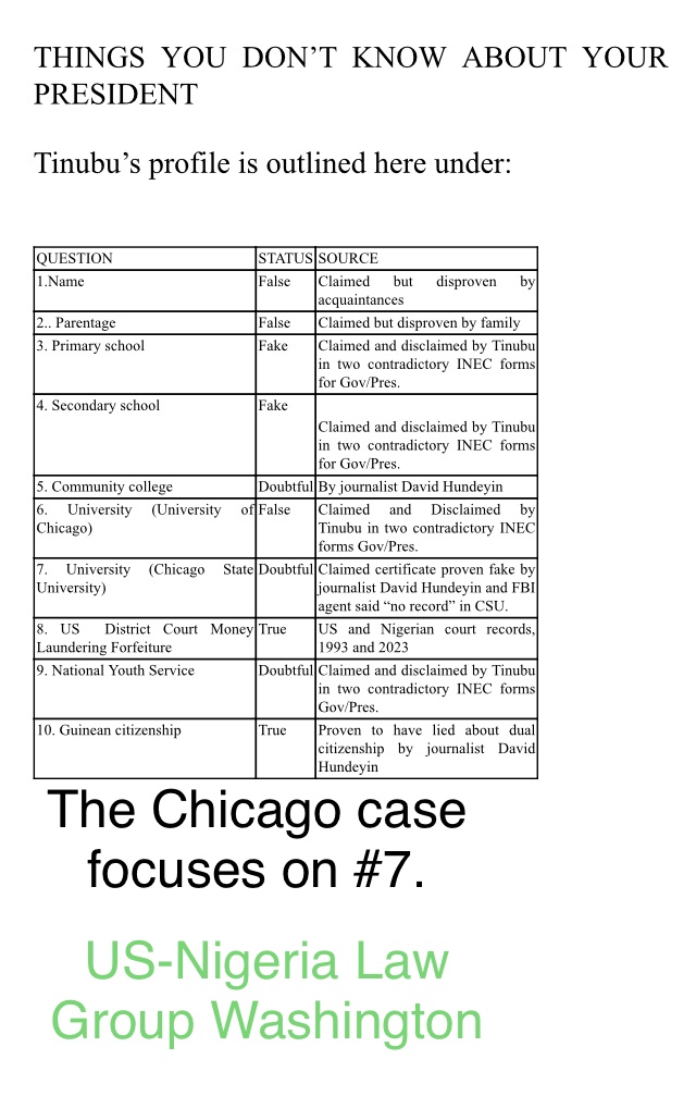 “It should be noted that 75% of Tinubu’s academic claims have been disproven as bogus by Tinubu himself in two contradictory INEC forms. CSU is the last one. He should happily allow the records release to prove he is not a total fraud.