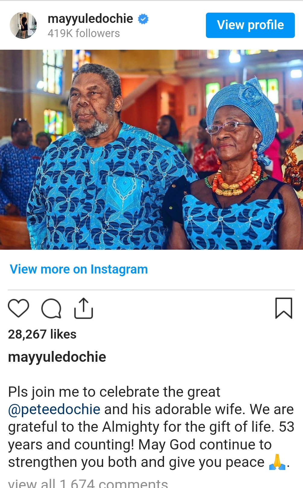 May Edochie, first wife of popular thespian, Yul Edochie, has sent tongues wagging on social media over her online post to her father-in-law and veteran actor Pete Edochie and his wife, who are celebrating their 53rd wedding anniversary.