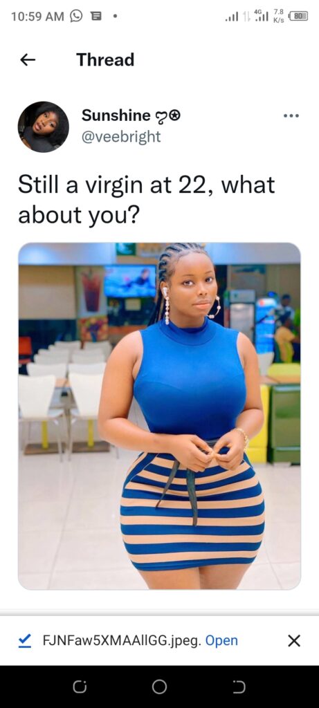 She said via her Twitter handle, @veebright: “Still a virgin at 22, what about you?”