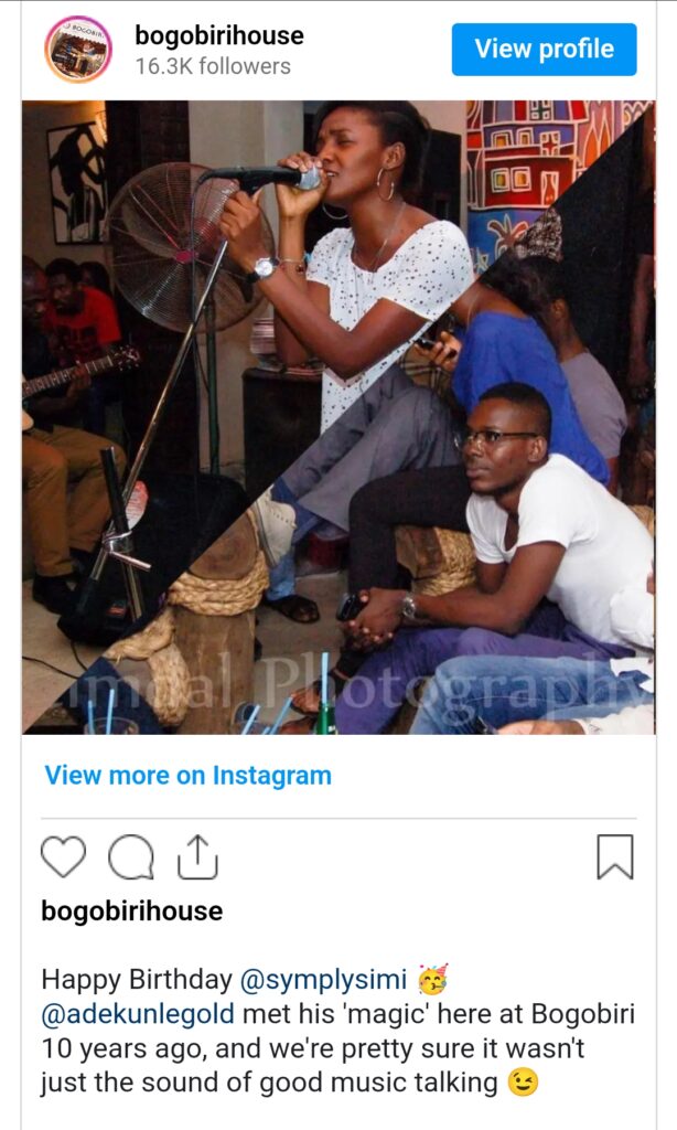 The post was captioned: “Happy Birthday @symplysimi @adekunlegold met his ‘magic’ here at Bogobiri 10 years ago, and we’re pretty sure it wasn’t just the sound of good music talking .”