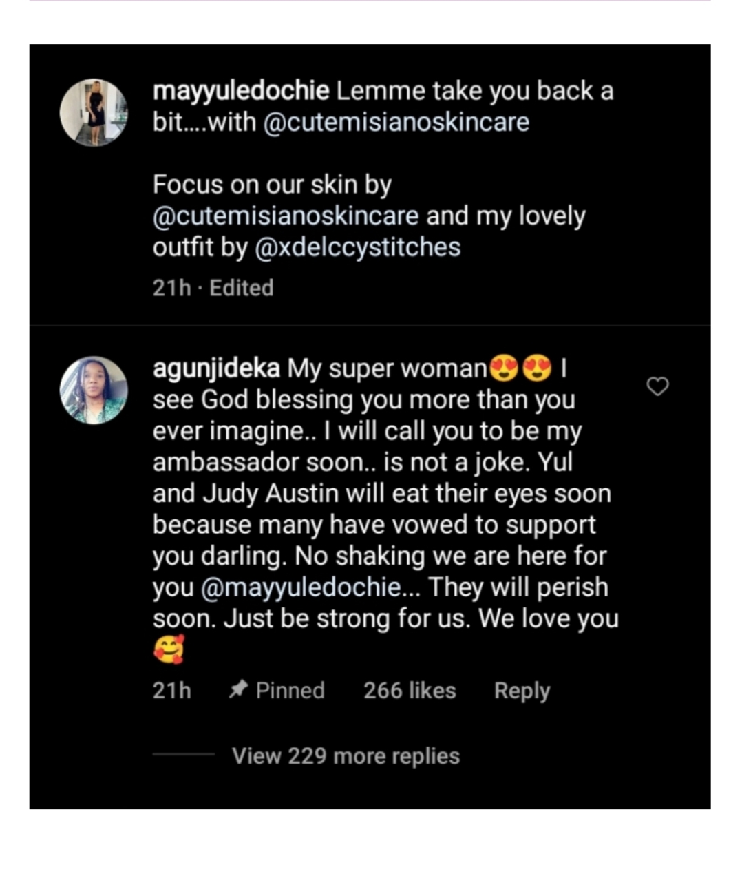 “My superwoman, I see God blessing you more than you ever imagined. I will call you to be my ambassador soon.. is not a joke. Yul and Judy Austin will eat their eyes soon because many have vowed to support you, darling. No shaking, we are here for you. They will perish soon. Just be strong for us. We love you.”