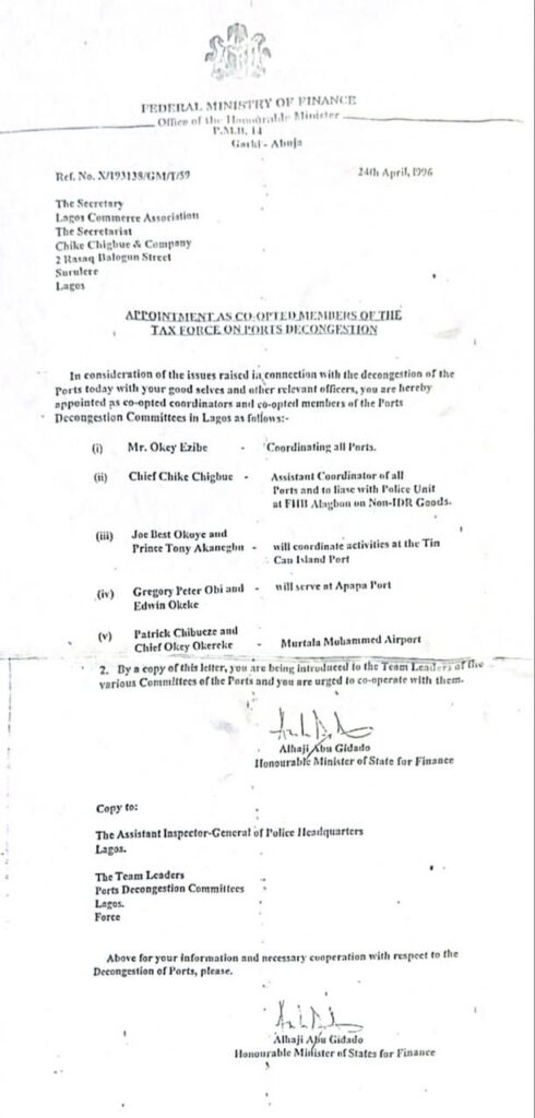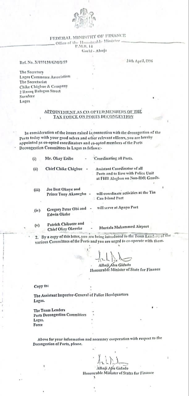 In a statement issued on Wednesday and titled “Our Engagement with General Abacha: Setting the Record Straight,” Obi, through his media aide Valentine Obienyem, released a copy of the official letter that documented his selection—alongside other importers and traders—into the Taskforce on Port Decongestion.