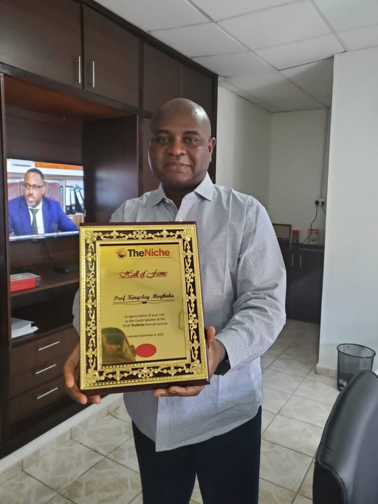 The former Deputy Governor of the Central Bank of Nigeria (CBN) and presidential candidate of the Young Progressives Party (YPP) in the 2019 elections, Professor Kingsley Moghalu, formally received TheNiche Hall of Fame plaque in his Abuja office on Monday, November 7.