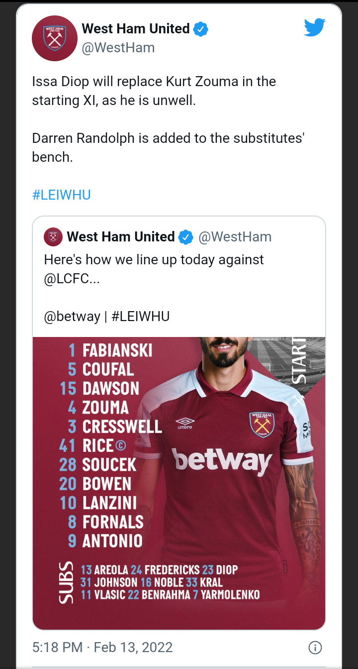 “Issa Diop will replace Kurt Zouma in the starting XI, as he is unwell,” West Ham wrote. “Darren Randolph is added to the substitutes’ bench.” the statement added.