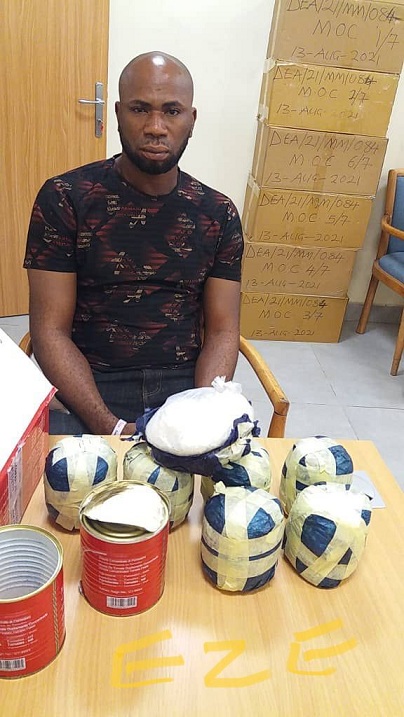 “The drug was concealed in tins of tomato branded ‘sunripe’ and packaged for the driver of a freight forwarding company to deliver at the airport export shed for onward movement to the UK. Though the freight company’s driver was initially arrested, follow-up investigations and subsequent sting operation led to the arrest of the kingpin behind the consignment, Okorie, at his Coker, Surulere, Lagos home on Wednesday 25th August 2021.” The statement read.