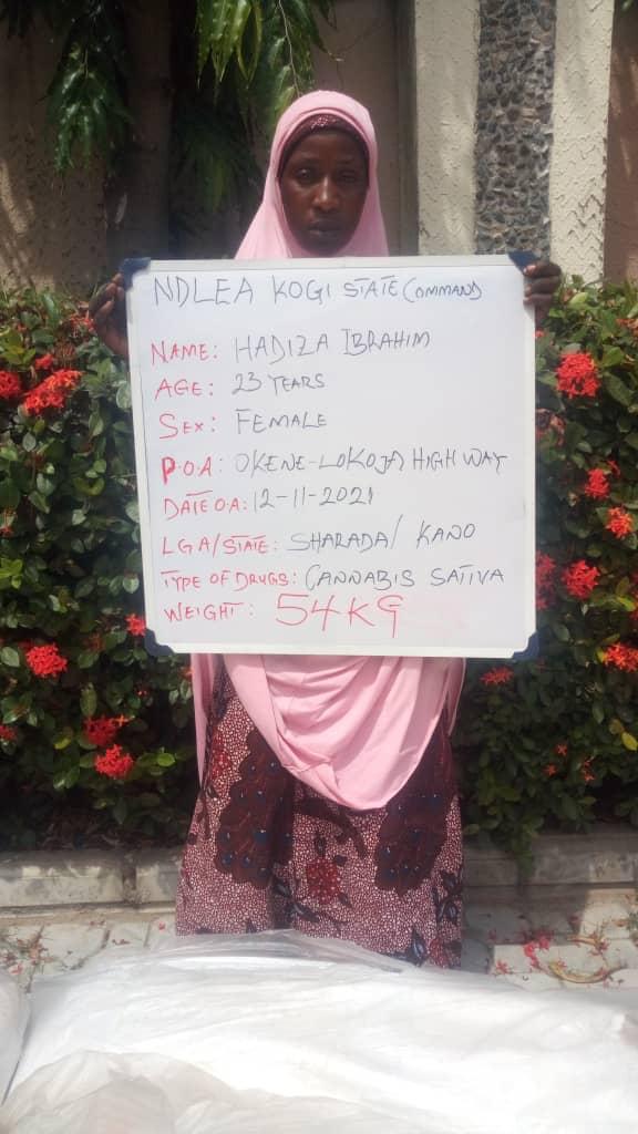 While 23-year-old Hadiza Ibrahim was arrested on Saturday, November 13, along Okene-Lokoja highway with 54kg of cannabis, one Sunday Nnam a.k.a Idowu was nabbed same day in Emene area of Enugu with 45kg of same substance. In the same vein, one Umar Muhammad was arrested with 25,700 capsules of Tramadol weighing 15.1kg in Tudun Hatsi area of Gombe.