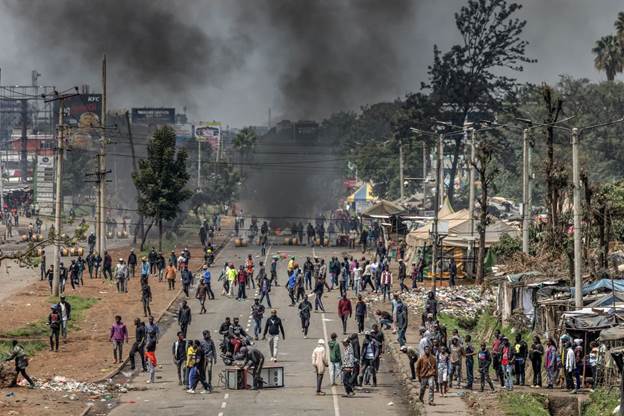 Protesters gather to block a main road with burning barricades and urban debris during clashes at Saba Saba Day demonstrations in Nairobi on July 7. Luis Tato/AFP/Getty Images.