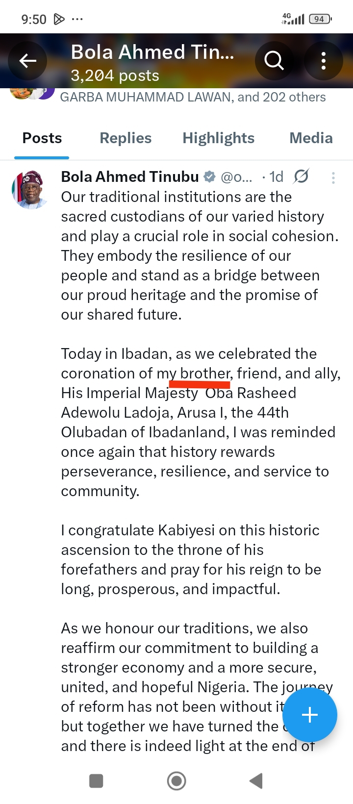 Tinubu has said: “…Today in Ibadan, as we celebrated the coronation of my brother, friend, and ally, His Imperial Majesty Oba Rasheed Adewolu Ladoja, Arusa I, the 44th Olubadan of Ibadanland, I was reminded once again that history rewards perseverance, resilience, and service to community….”