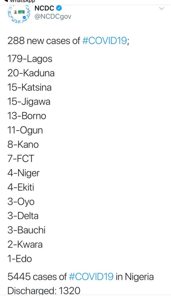 Announcing this at 1.01am on Saturday, the Nigeria Centre for Disease Control (NCDC) said the 288 new cases were reported from 15 states. It also put the number of deaths recorded in the last 24 hours at three.