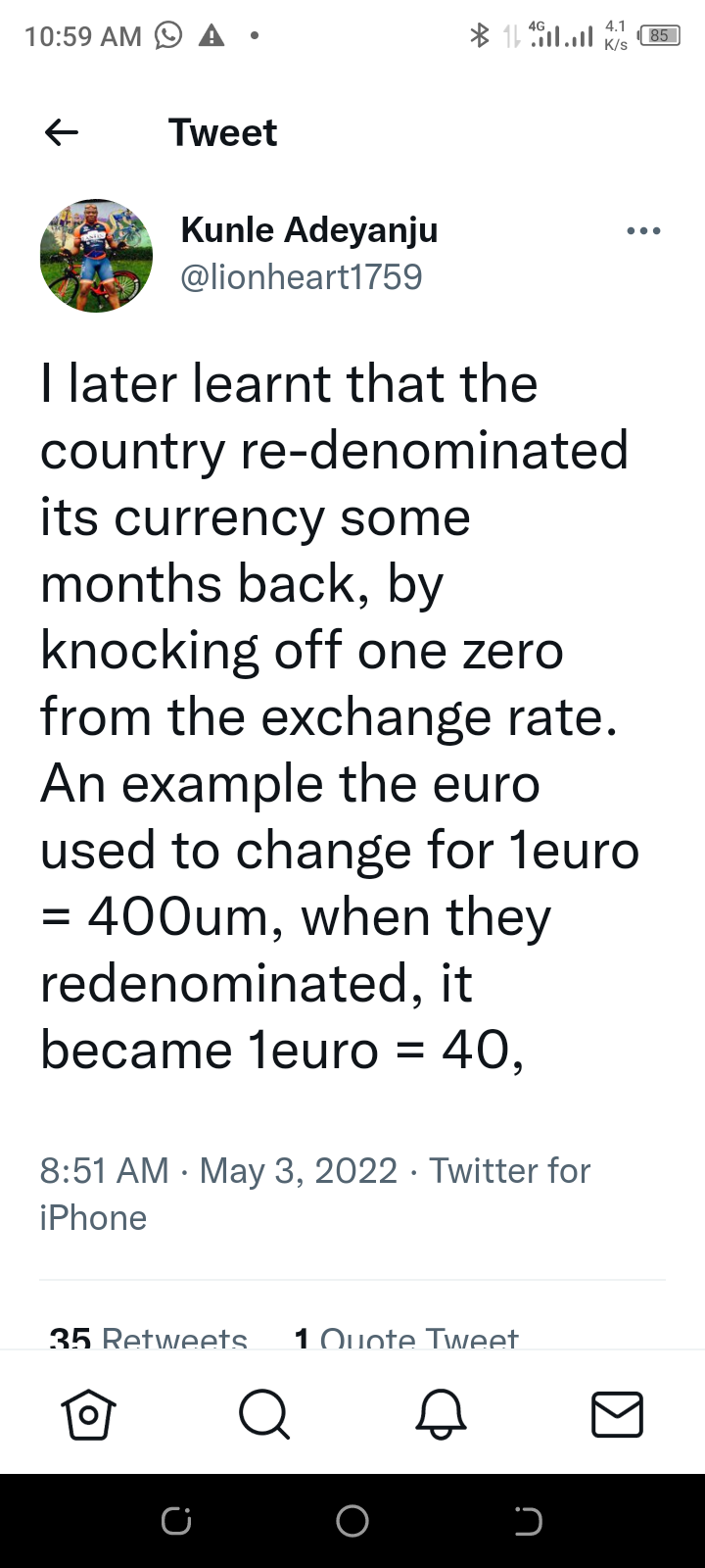 “I later learnt that the country re-denominated its currency some months back, by knocking off one zero from the exchange rate. An example the euro used to change for 400um. When they redenominated, it became 1euro = 40um