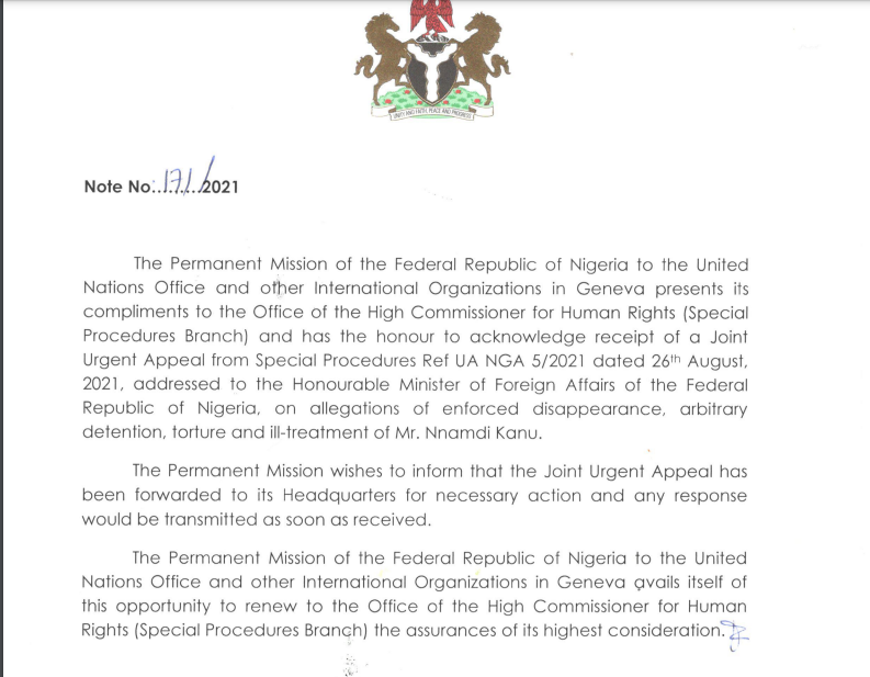 In one document, Nigeria’s Permanent Mission acknowledged the receipt of a query on September 17, addressed to Geoffrey Onyeama, Nigeria’s minister of foreign affairs. He was asked to answer questions on the allegation of the forced disappearance and arbitrary detention, torture and ill-treatment of Nnamdi Kanu.