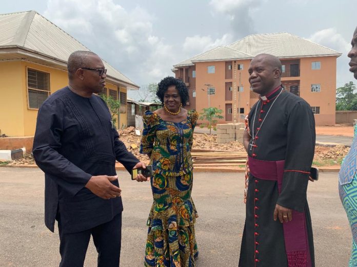 The Vice Presidential Candidate of the PDP, Mr. Peter Obi ( left), accompanied by Prof. Chinyere Stella Okunna (middle), during the visit and further donation to the School of Nursing and Midwifery of Anglican Bishop of Amichi, Most Rev. Dr. Ephraim Ikeakor, at Amichi.